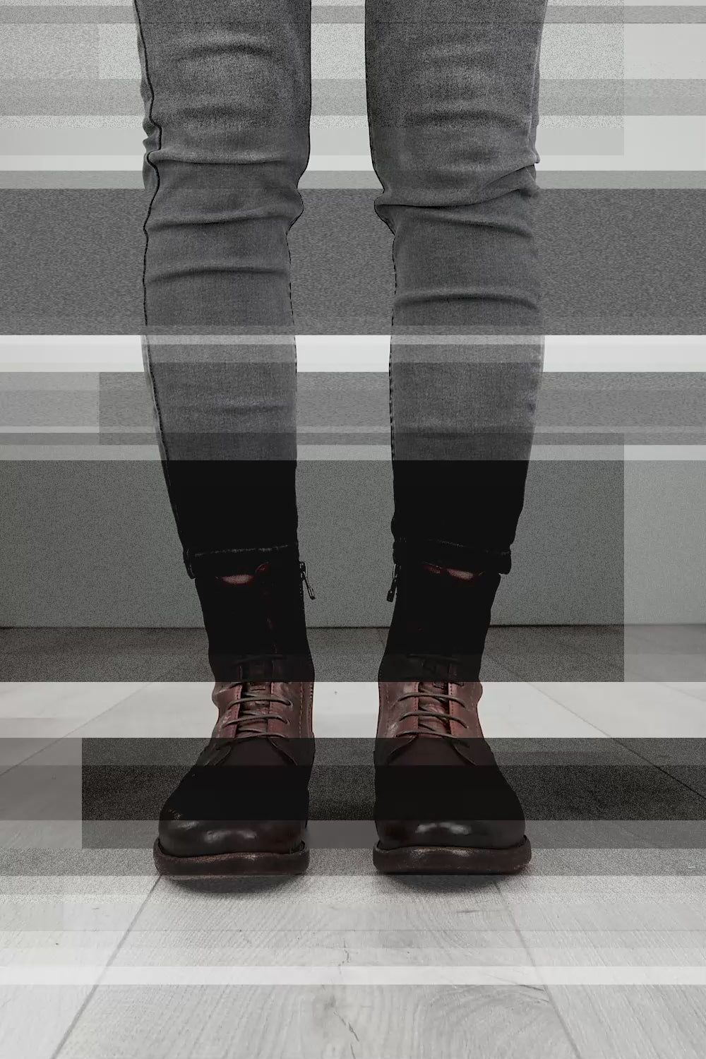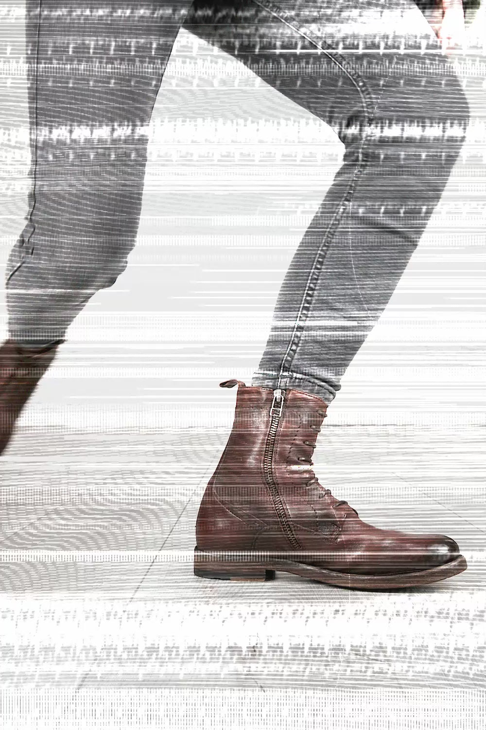 To create a distressed, urban look, this style also undergoes an exclusive antiquing process called stone washing, consisting of washing the shoe in open washing machines filled with water and pumice stones. The shades of uneven intensity are then emphasised through careful waxing and brushing.