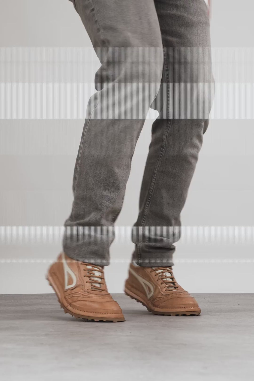 The upper and the insole are finally sewed to a beautifully constructed lightweight outsole, made of regenerated leather and a rubber lug, with and eye catching geometric tread pattern which provide grip and traction without weighing down the overall esthetics.