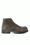 A sturdy, grounded boot exuding personality and a military allure. Crafted from the best Italian oiled calf suede, waxed in a barrel to make it more water resistant and durable, and to create a beautiful bouquet of wild greyish tones, this boot features a frontal lacing with side zippers, precision stitching and a solid, military-grade St Moritz lug sole. A failsafe option for any urban terrain.